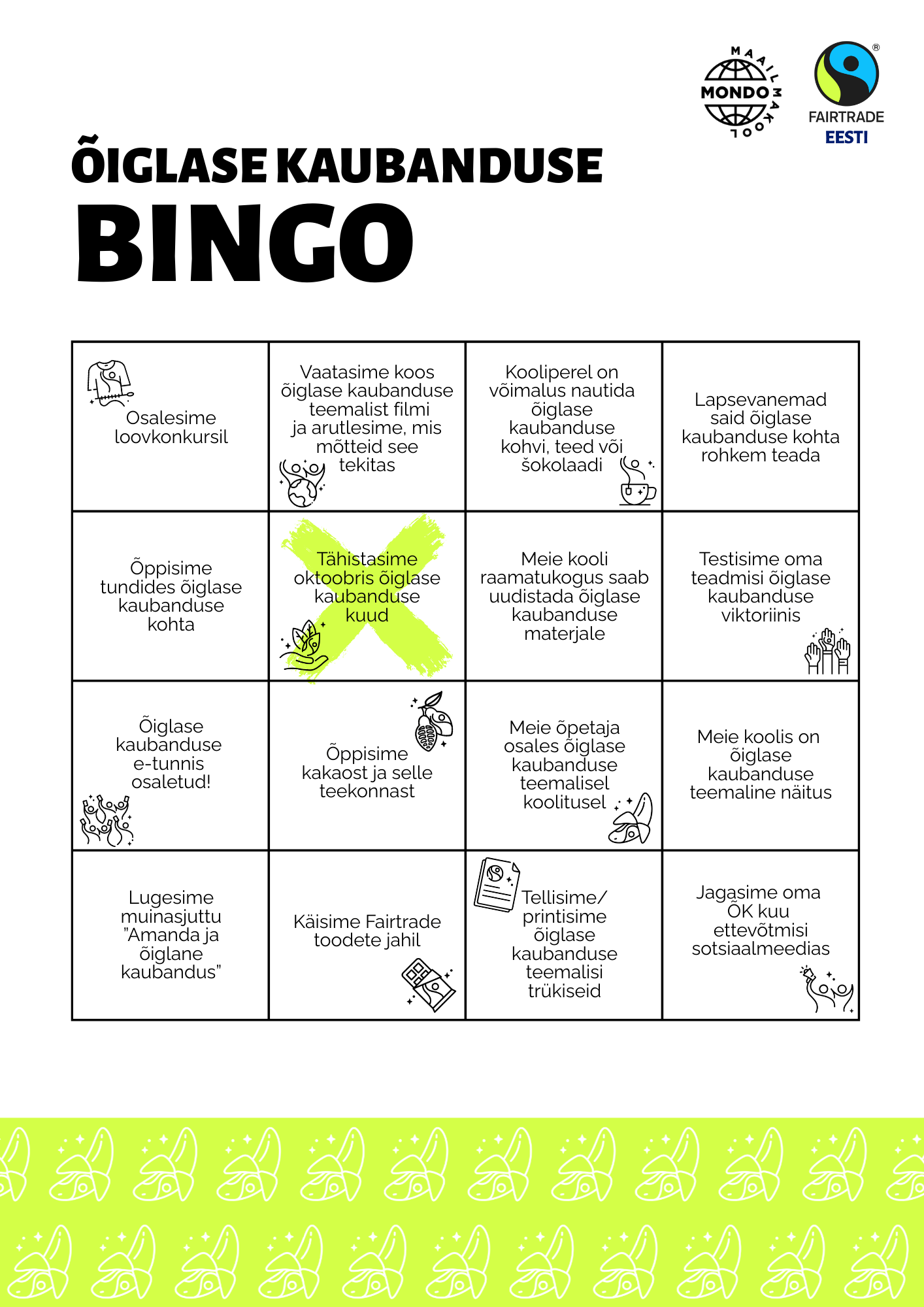 Bingo aitab osalejatel avastada ja rakendada õiglase kaubanduse põhimõtteid mängulisel ja lõbusal viisil. Proovi kogu klassi või kooliga bingo kõik ruudud värvitud saada! Osalemiseks tee igast tegevusest pilt, lisa ühte Google Drive’i kausta ja saada link Mondole (demy.landson@mondo.org.ee). Kool, kes saab esimesena tehtud kõik ruudustikul märgitud tegevused, saab auhinnaks korvi Fairtrade’i toodetega. Bingo saab alla laadida ja välja printida siit.